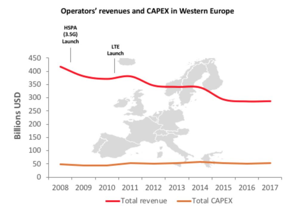 Randall’s statement is understandable, as Mobile Operators today are feeling the pressure to find the next revenue growth driver. Over the last 10 years, Operator’s revenues have been in decline (as shown in the Northstream graph below), with investments (CAPEX) required for the growth of mobile data consumption remaining flat.