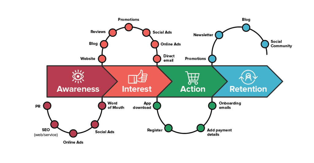 The funnel above gives a great overview but mapping out a detailed user flow will ensure your strategy is tight and easy to follow. It also gives you an opportunity to outline what channels you want to utilize, alongside customer comms that need to be in place pre, during and post launch. Here’s an overview of a typical user flow, which also includes the retention stage you’ll need to consider after action.