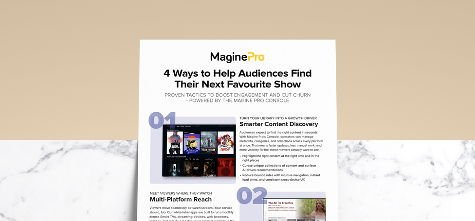 That’s why we’ve put together a quick guide: “4 Ways to Help Audiences Find Their Next Favourite Show.” It’s a short, practical read designed for operators who want to boost engagement and reduce churn without adding complexity. The guide shares proven strategies drawn from real Magine Pro customers, showing how smarter discovery, cross-platform consistency, actionable data, and flexible monetisation can all work together to keep viewers watching longer.